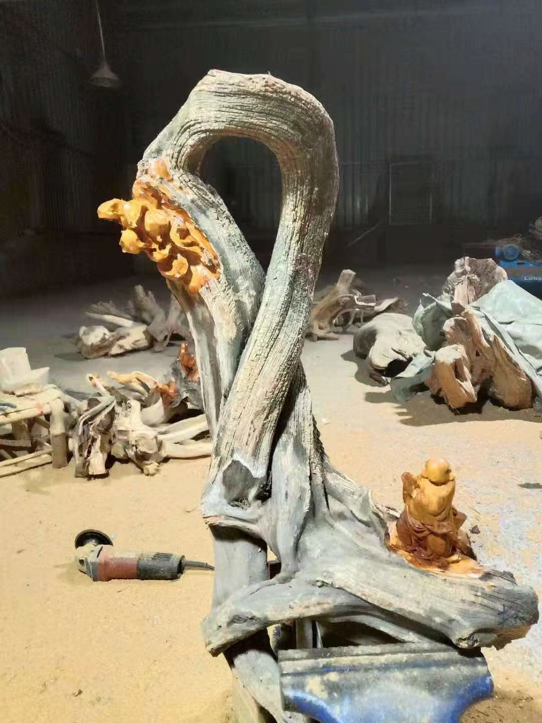 木の本来の形や曲がりを活かした「自然流」の造形を大切にしています。工房での製作風景(画像参照)からも分かる通り、原木の持つ力強いエネルギーを損なうことなく、芸術品へと昇華させます。